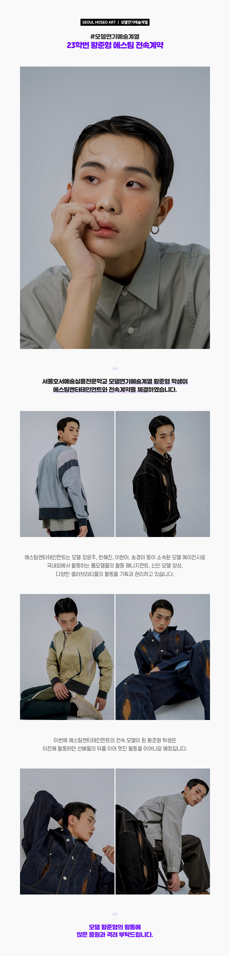 서울호서예술실용전문학교 모델연기예술계열 황준형 학생이 에스팀엔터테인먼트와 전속계약을 체결하였습니다. 에스팀엔터테인먼트는 모델 장윤주, 한혜진, 이현이, 송경아 등이 소속된 모델 에이전시로 국내외에서 활동하는 톱모델들의 활동 매니지먼트, 신인 모델 양성, 다양한 셀러브리티들의 활동을 기획과 관리하고 있습니다.