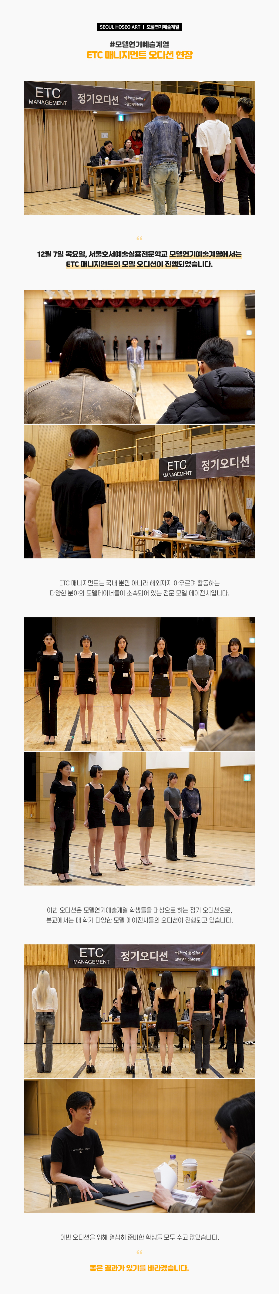 12월 7일 목요일, 서울호서예술실용전문학교 모델연기예술계열에서는 ETC 매니지먼트의 모델 오디션이 진행되었습니다. ETC 매니지먼트는 국내 뿐만 아니라 해외까지 아우르며 활동하는 다양한 분야의 모델테이너들이 소속되어 있는 전문 모델 에이전시입니다.