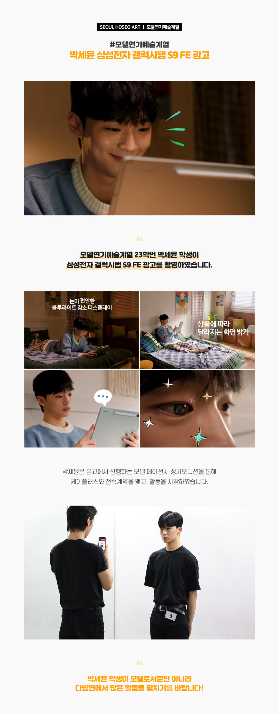 모델연기예술계열 23학번 박세윤이 삼성전자 갤럭시탭 S9 FE 광고를 촬영하였습니다. 박세윤은 본교에서 진행하는 모델 에이전시 정기오디션을 통해 케이플러스와 전속계약을 맺고, 활동을 시작하였습니다.