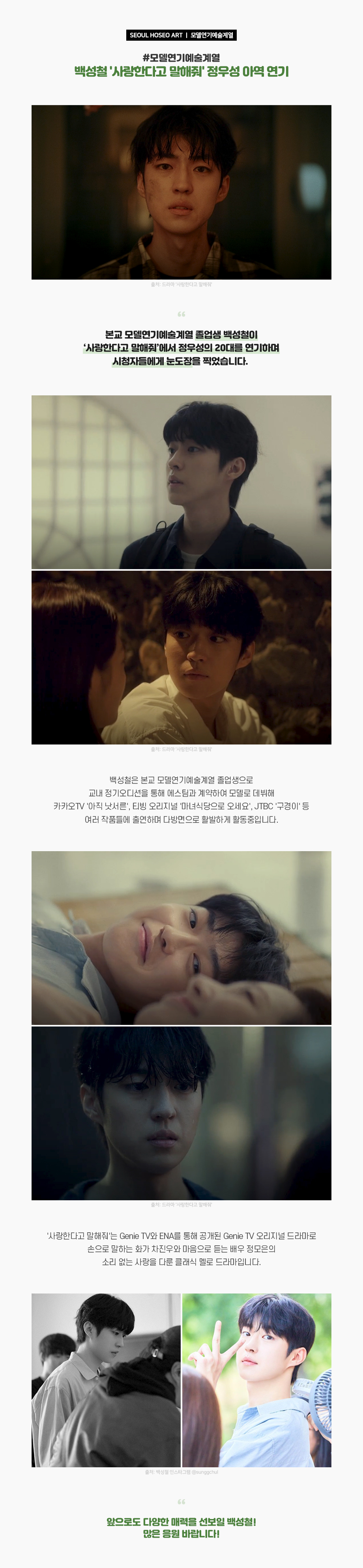 서울호서예술실용전문학교 모델연기예술계열 졸업생 백성철이 '사랑한다고 말해줘'에서 정우성의 20대를 연기하며 시청자들에게 눈도장을 찍었습니다. 백성철은 본교 모델연기예술계열 졸업생으로 교내 정기오디션을 통해 에스팀과 계약하여 모델로 데뷔해 카카오TV '아직 낫서른', 티빙 오리 지널 '마녀식당으로 오세요', JTBC '구경이' 등 여러 작품들에 출연하며 다방면으로 활발하게 활동중입니다.