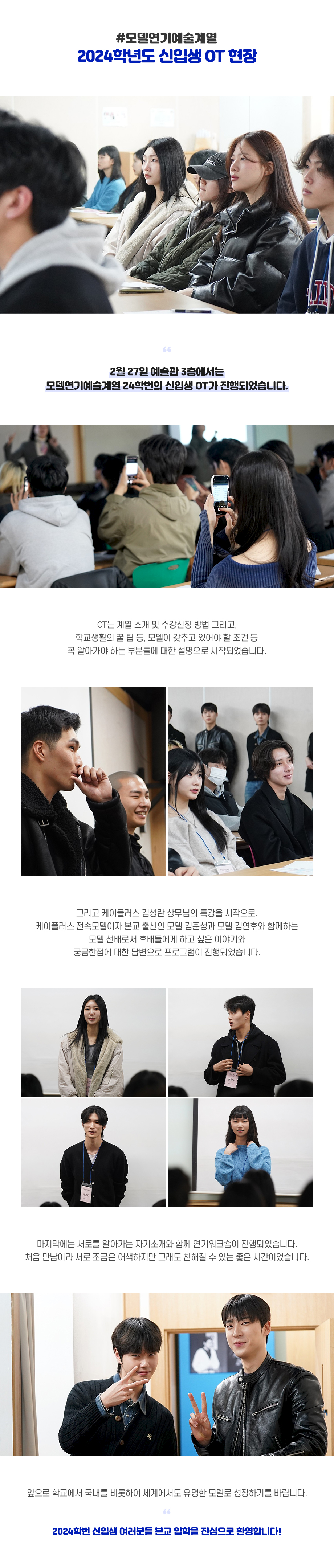 2월 27일 예술관 3층에서는 모델연기예술계열 24학번의 신입생 OT가 진행되었습니다. OT는 계열 소개 및 수강신청 방법 그리고, 학교생활의 꿀 팁 등, 모델이 갖추고 있어야 할 조건 등 꼭 알아가야 하는 부분들에 대한 설명으로 시작되었습니다. 그리고 케이플러스 김성란 상무님의 특강과 함께, 케이플러스 전속모델이자 본교 출신인 모델 김준성과 모델 김연후와 함께하는 모델 선배로서 후배들에게 하고 싶은 이야기와, 궁금한점에 대한 답변으로 프로그램이 진행되었습니다.