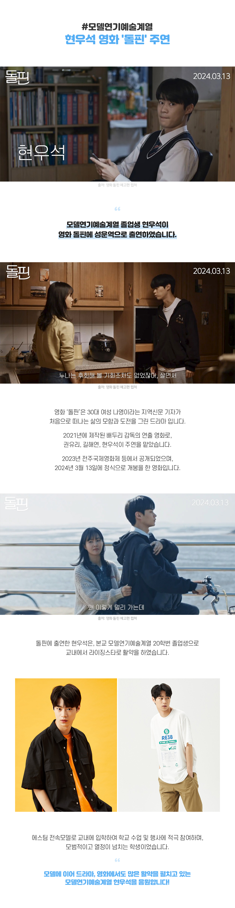 모델연기예술계열 졸업생 현우석이 영화 돌핀에 성운역으로 출연하였습니다. 영화 돌핀은 30대 여성 나영이라는 지역신문 기자가 처음으로 떠나는 삶의 모함과 도전을 그린 드라마 입니다. 2021년에 제작된 배두리 감독의 연출 영화로, 권유리, 길해연, 현우석이 주연을 맡았습니다. 2023년 전주국제영화제 등에서 공개되었으며, 2024년 3월 13일에 정식으로 개봉을 한 영화입니다.