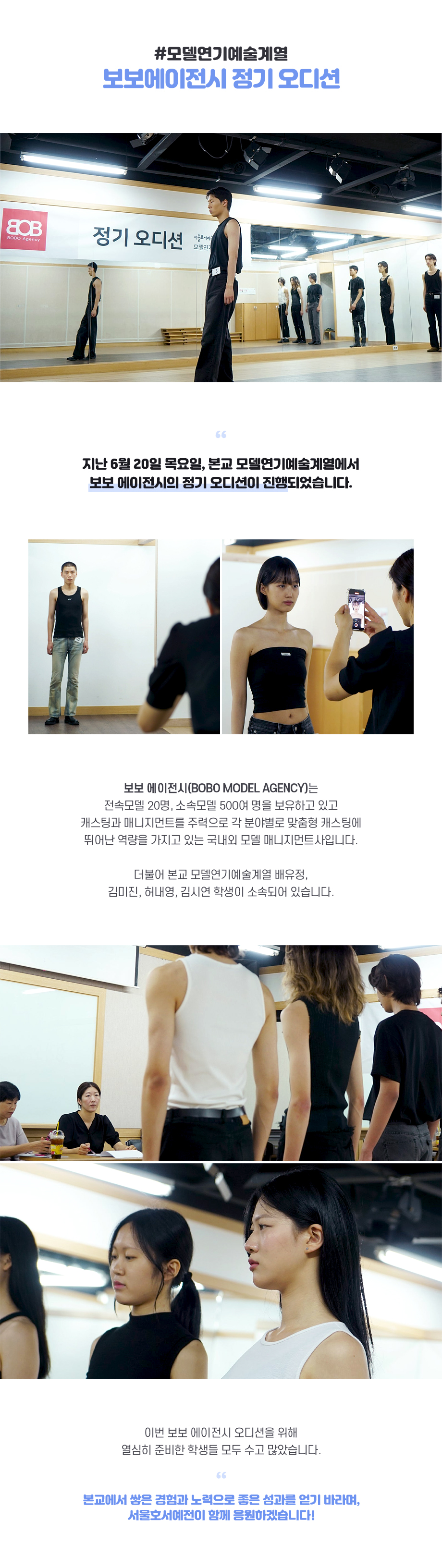 지난 6월 20일, 서울호서예술실용전문학교 모델연기예술계열에서 보보 에이전시의 정기 오디션이 진행되었습니다. 보보에이전시(BOBO MODEL AGENCY)는 전속모델 20명, 소속모델 500여 명을 보유하고 있고 캐스팅과 매니지먼트를 주력으로 각 분야별로 맞춤형 캐스팅에 뛰어난 역량을 가지고 있는 국내외 모델 매니지먼트사입니다.