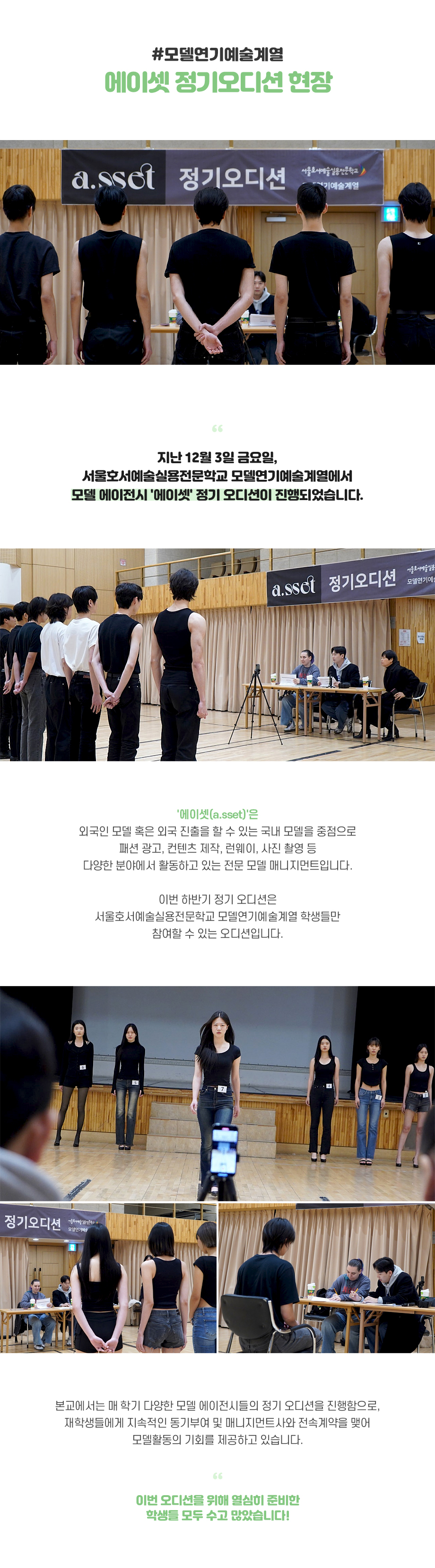 지난 12월 3일 금요일, 서울호서예술실용전문학교 모델연기예술계열에서 모델 에이전시 '에이셋' 정기 오디션이 진행되었습니다. '에이셋(a.sset)'은 외국인 모델 혹은 외국 진출을 할 수 있는 국내 모델을 중점으로 패션 광고, 컨텐츠 제작, 런웨이, 사진 촬영 등 다양한 분야에서 활동하고 있는 전문 모델 매니지먼트입니다.