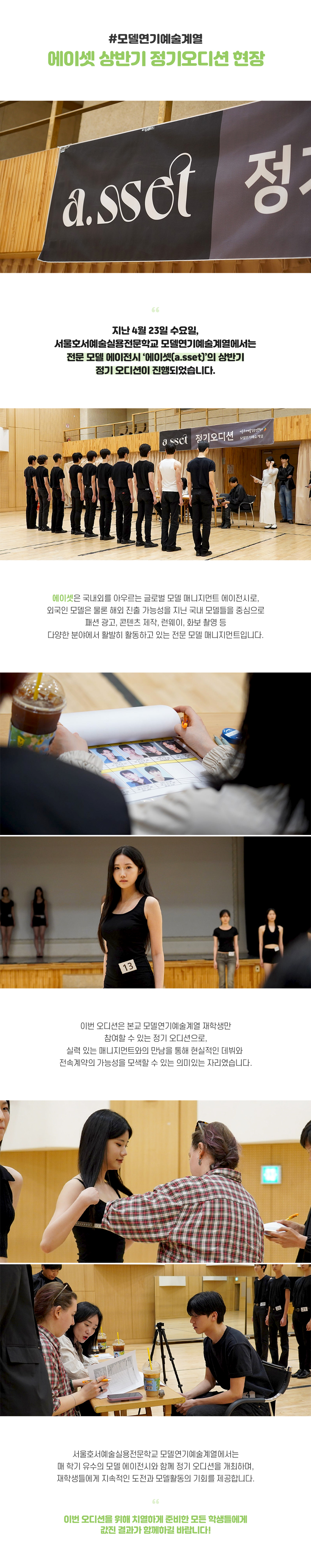 지난 4월 23일 수요일, 서울호서예술실용전문학교 모델연기예술계열에서는 전문 모델 에이전시 ‘에이셋(a.sset)’의 상반기 정기 오디션이 진행되었습니다. 에이셋은 국내외를 아우르는 글로벌 모델 매니지먼트 에이전시로, 외국인 모델은 물론 해외 진출 가능성을 지닌 국내 모델들을 중심으로 패션 광고, 콘텐츠 제작, 런웨이, 화보 촬영 등 다양한 분야에서 활발히 활동하고 있는 전문 모델 매니지먼트입니다.