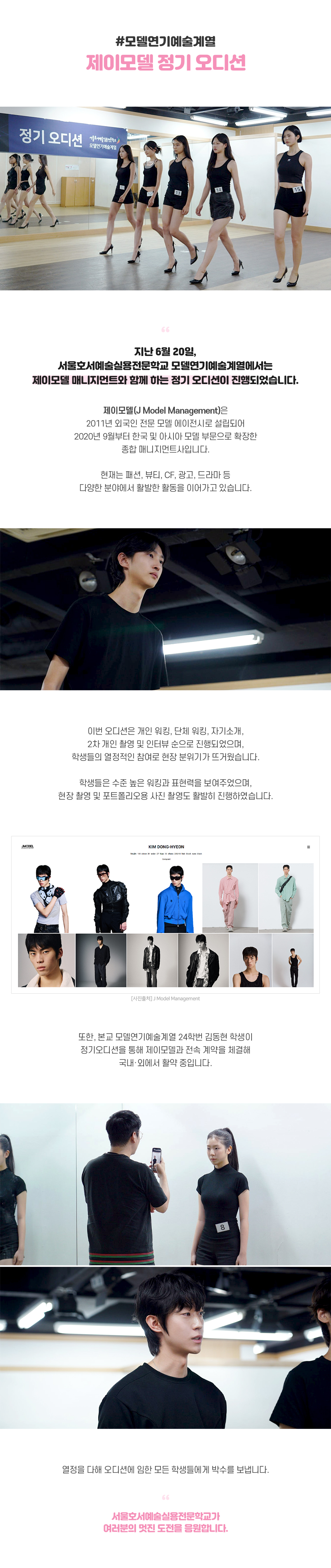 지난 6월 20일, 서울호서예술실용전문학교 모델연기예술계열에서는 제이모델 매니지먼트와 함께 하는 정기 오디션이 진행되었습니다. '제이모델(J Model Management)'은 2011년 외국인 전문 모델 에이전시로 설립되어 2020년 9월부터 한국 및 아시아 모델 부문으로 확장한 종합 매니지먼트사입니다.