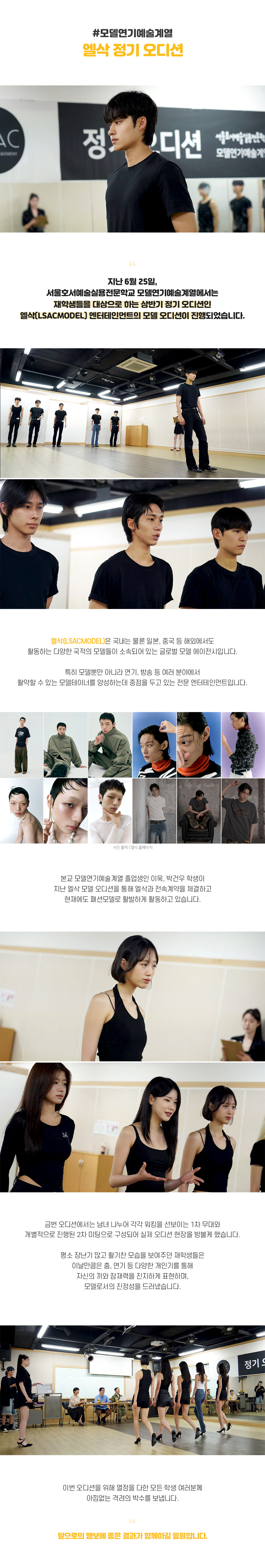지난 6월 25일, 서울호서예술실용전문학교 모델연기예술계열에서는 재학생들을 대상으로 하는 상반기 정기 오디션인 엘삭(LSACMODEL) 엔터테인먼트의 모델 오디션이 진행되었습니다. 엘삭은 국내는 물론 일본, 중국 등 해외에서도 활동하는 다양한 국적의 모델들이 소속되어 있는 글로벌 모델 에이전시입니다.