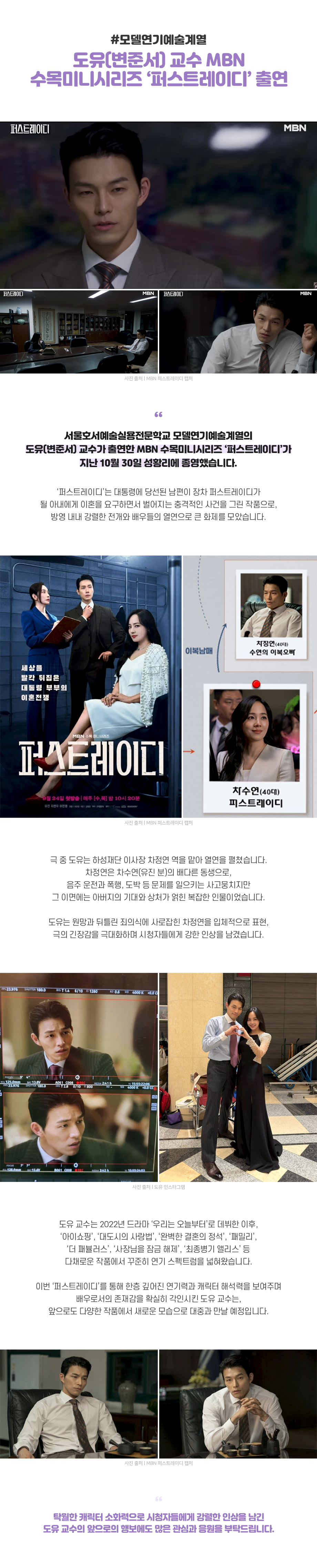 서울호서예술실용전문학교 모델연기예술계열의 도유(변준서) 교수가 출연한 MBN 수목미니시리즈 ‘퍼스트레이디’가 지난 10월 30일 성황리에 종영했습니다.