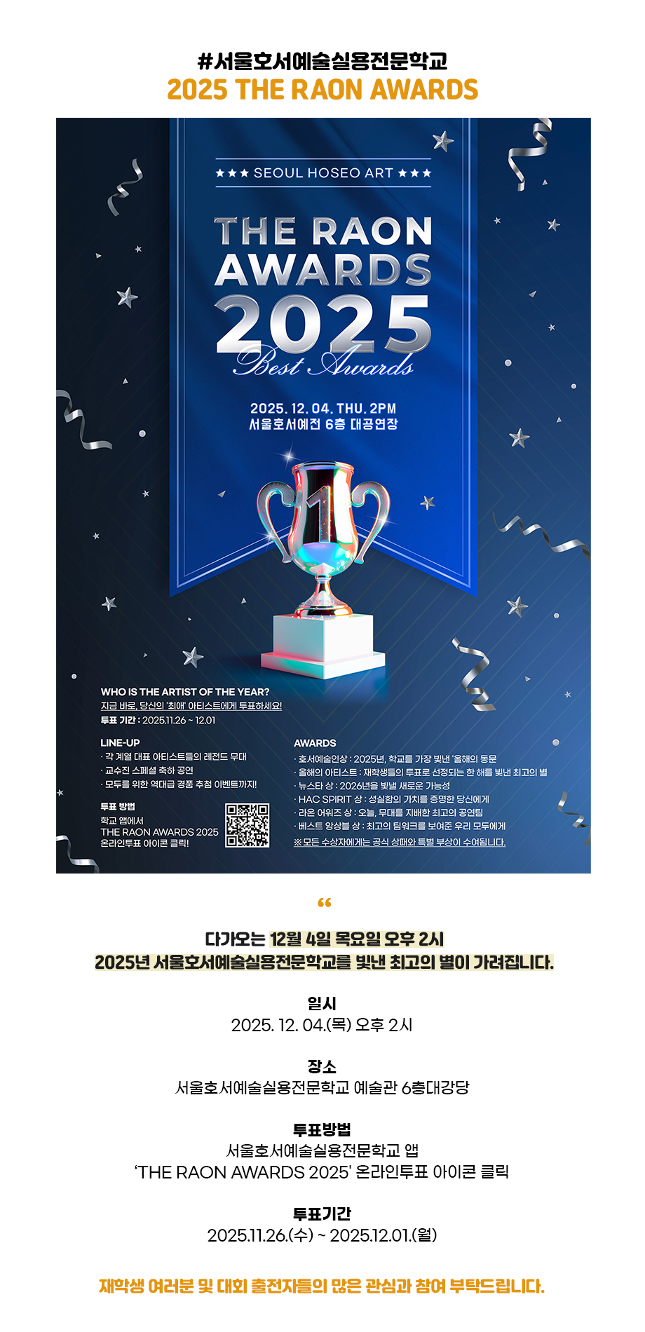 다가오는 12월 4일 목요일 오후 2시 서울호서예술실용전문학교 THE RAON AWARDS 2025(라온 어워즈)가 개최됩니다.
