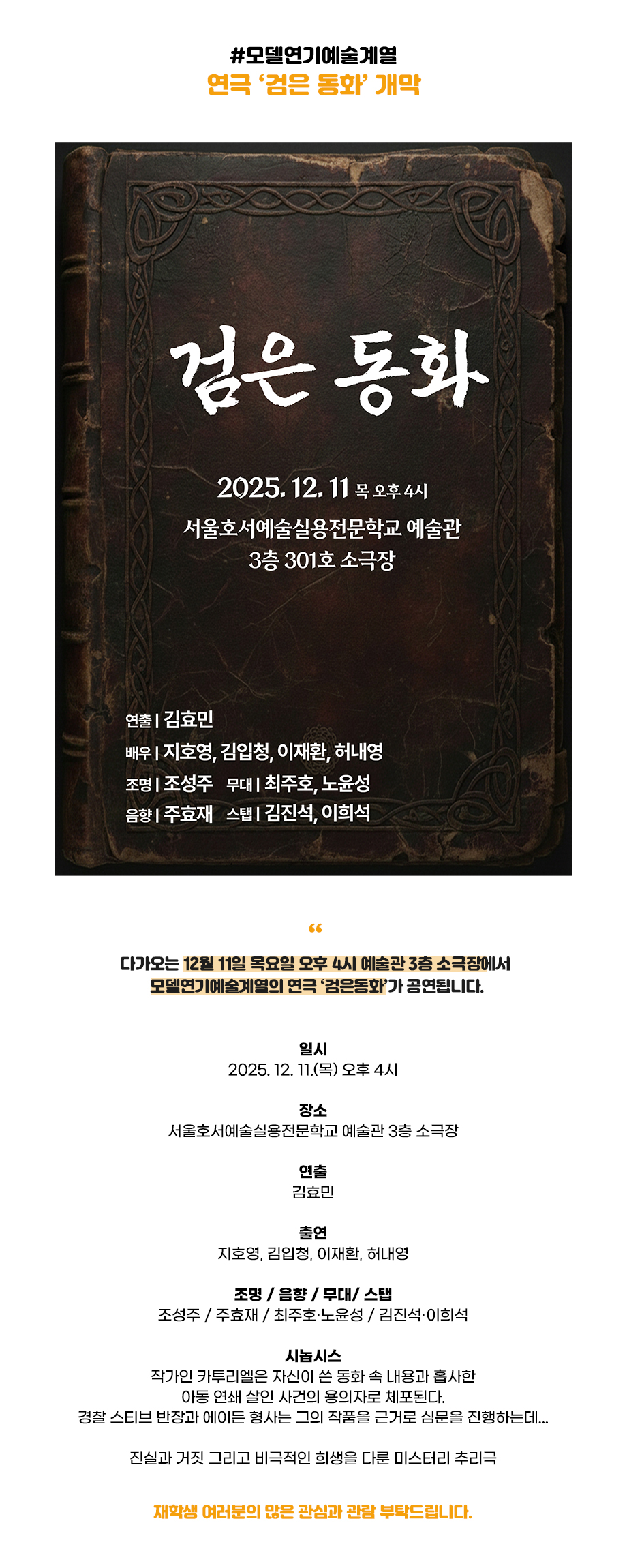 다가오는 12월 11일 목요일 오후 4시 서울호서예술실용전문학교 모델연기예술계열의 연극 '검은동화'가 공연됩니다.