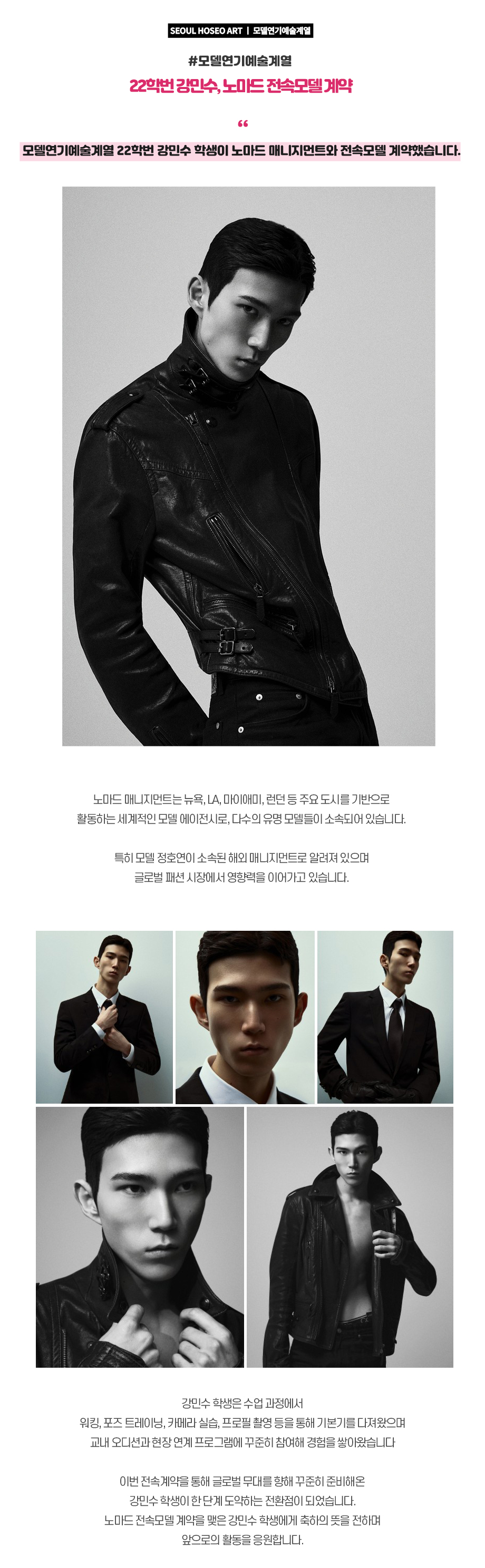 모델연기예술계열 22학번 강민수 학생이 노마드 매니지먼트와 전속모델 계약했습니다.