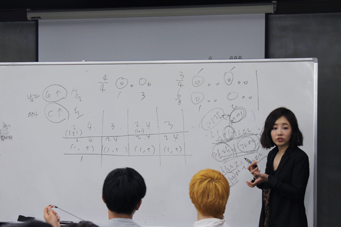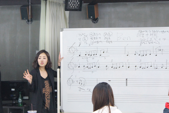 이번 작사 능력 배양에 관한 수업에서는 베니 교수가 학생들에게 10마디 정도의 기존 곡의 음계를 주고 이에 학생들이 새롭게 자신의 감성을 더해 작사를 해보는 것으로 수업이 진행되었습니다.