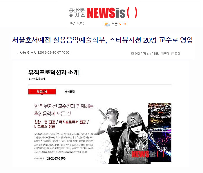 “최신 컴퓨터음악 전용 장비 30여대와 대형 음악제작실, 녹음실 2곳, 중형 공연장은 물론 학기 중 수차례 홍대앞 클럽 대관 및 다양한 장학금 지원을 통해 전공학생들을 지원할 것”이라며 “국내 최대 힙합 전문 학과로서 수준 높은 뮤지션을 양성하겠다”고 밝혔다.