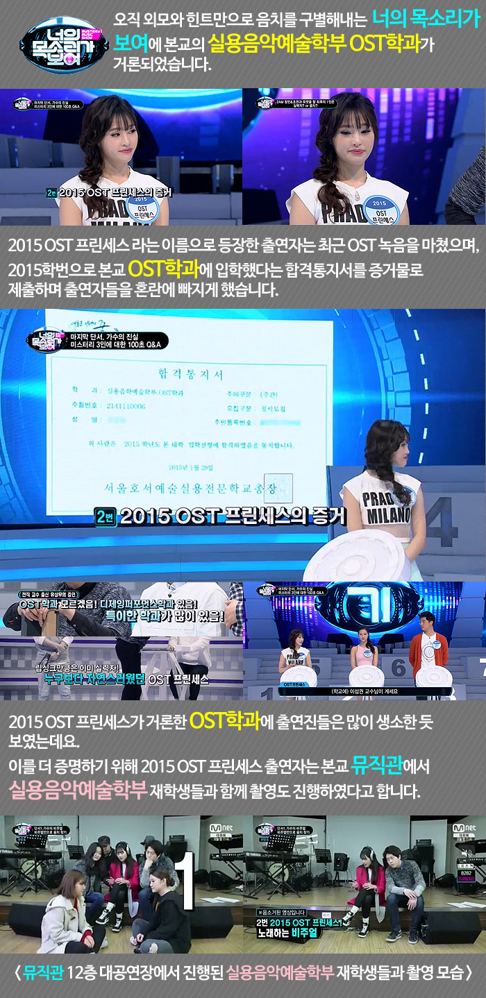 OST 프린세스라는 이름을 가진 출연자는 본교의 학생은 아니었지만 프로그램을 빛내기 위해 본교 뮤직관 대공연장을 찾아 실용음악예술학부 재학생들과 함께 촬영도 하는등 게스트를 속이기 위한 많은 준비를 했었습니다.