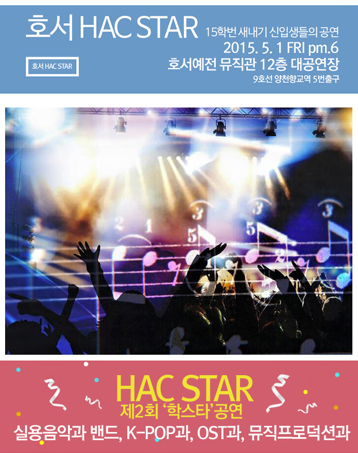 실용음악과밴드, K-POP과, OST과, 뮤직프로덕션과 학생들 모두가 함께 하는 제2회 'HAC STAR'(학스타) 공연에 많은 관심 부탁드립니다.