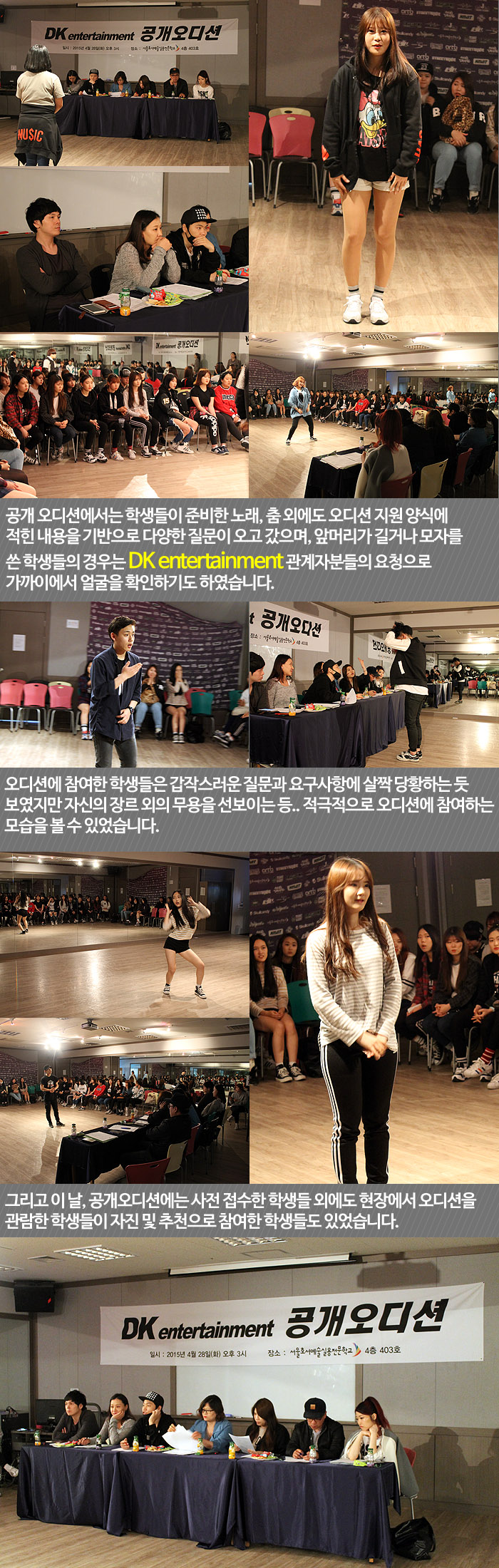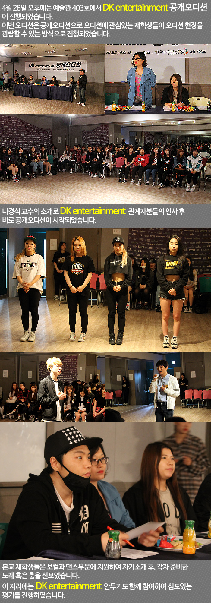걸그룹 에이데일리 소속사인 DK entertainment에서 지난 4월 28일 본교를 방문하여 공개오디션이 진행되었습니다.