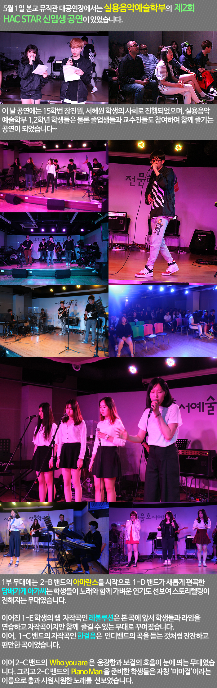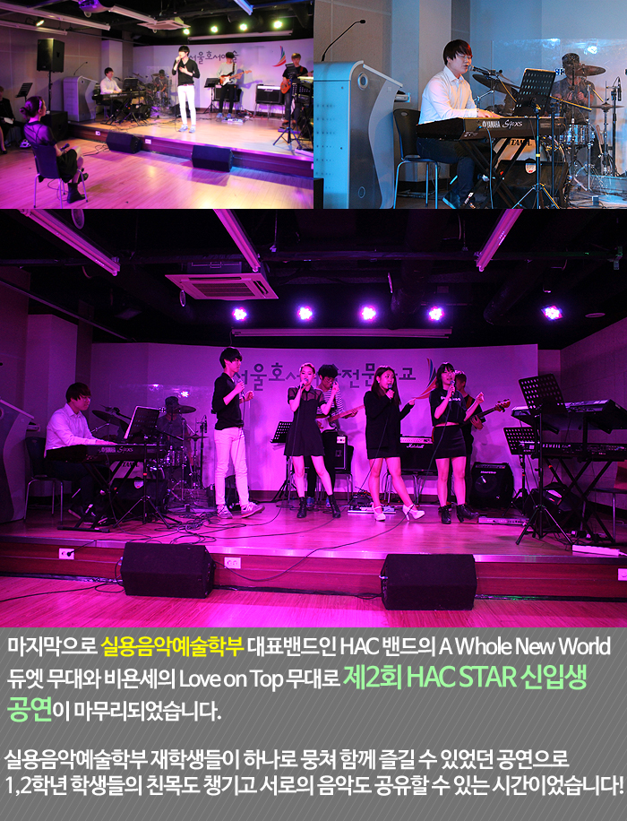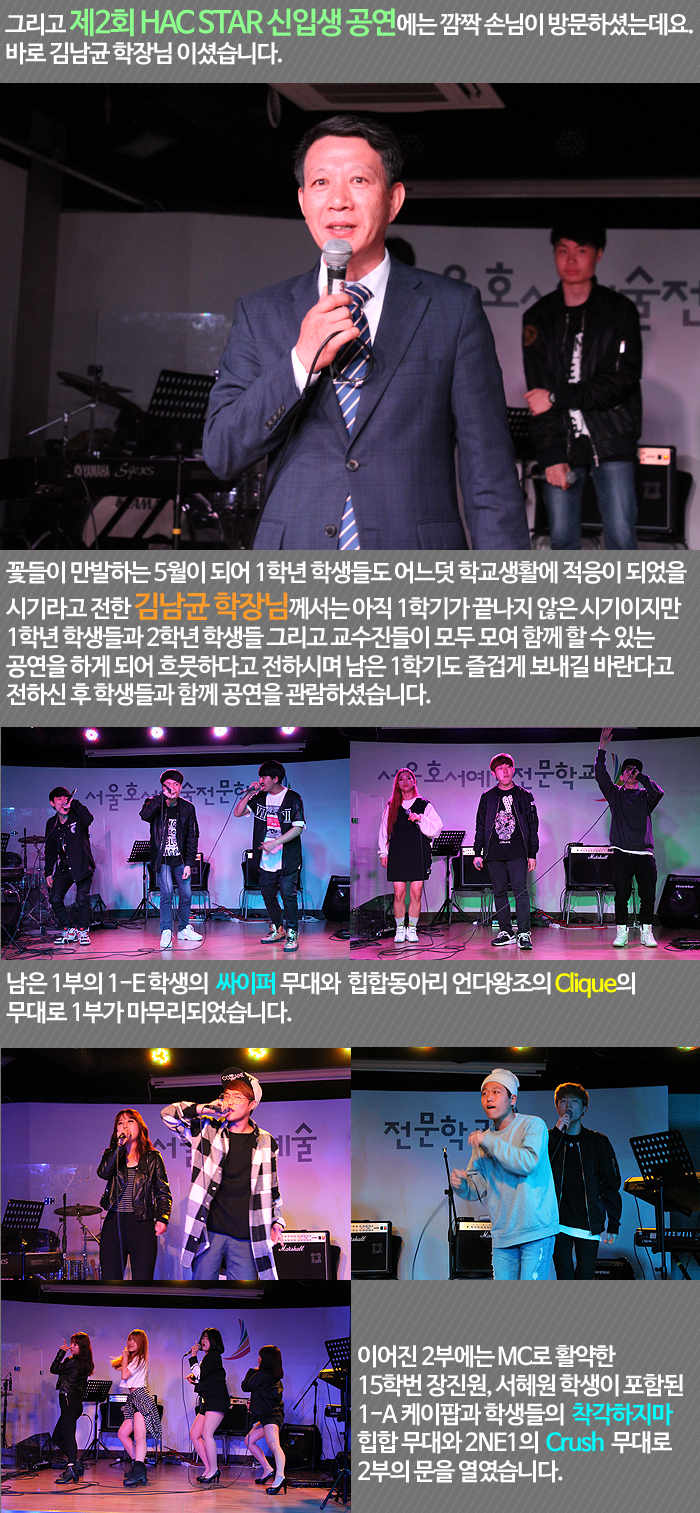 지난 5월 1일은 실용음악예술학부 재학생들과 졸업생들이 함께 어우러진 제2회 HAC STAR 신입생 공연이 진행되었습니다.