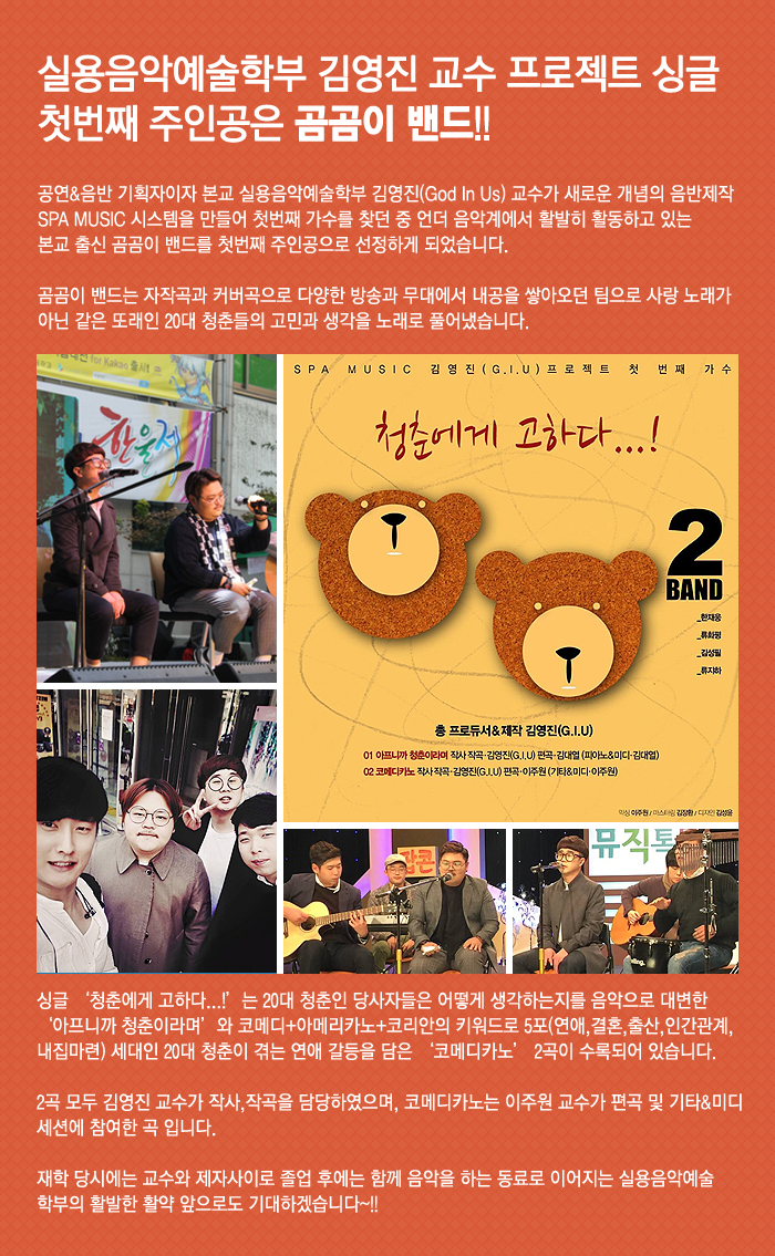 공연&음반 기획자이자 본교 실용음악예술학부 김영진(God In Us) 교수가 새로운 개념의 음반제작 SPA MUSIC 시스템을 만들어 첫번째 가수를 찾던 중 언더 음악계에서 활발히 활동하고 있는 본교 출신 곰곰이 밴드를 첫번째 주인공으로 선정하게 되었습니다.