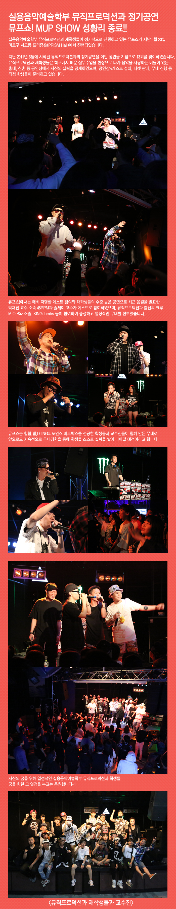 실용음악예술학부 뮤직프로덕션과 재학생들이 정기적으로 진행하고 있는 뮤프쇼가 지난 5월 23일 마포구 서교동 프리즘홀(PRISM Hall)에서 진행되었습니다.