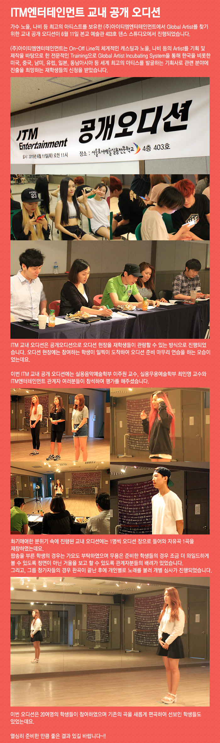 가수 노을, 나비 등 최고의 아티스트를 보유한 (주)아이티엠엔터테인먼트에서 Global Artist를 찾기위한 교내 공개 오디션이 6월 11일 본교 예술관 403호 댄스 스튜디오에서 진행되었습니다.