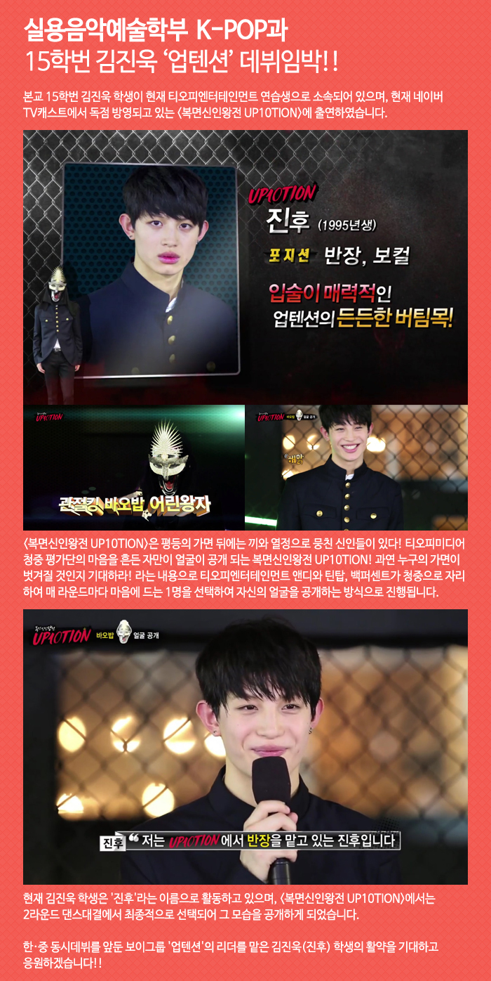 본교 실용음악예술학부 K-POP과 15학번 김진욱 학생이 티오피엔터테인먼트에서 데뷔하는 보이그룹 '업텐션'의 멤버로 데뷔를 앞두고 있습니다.
