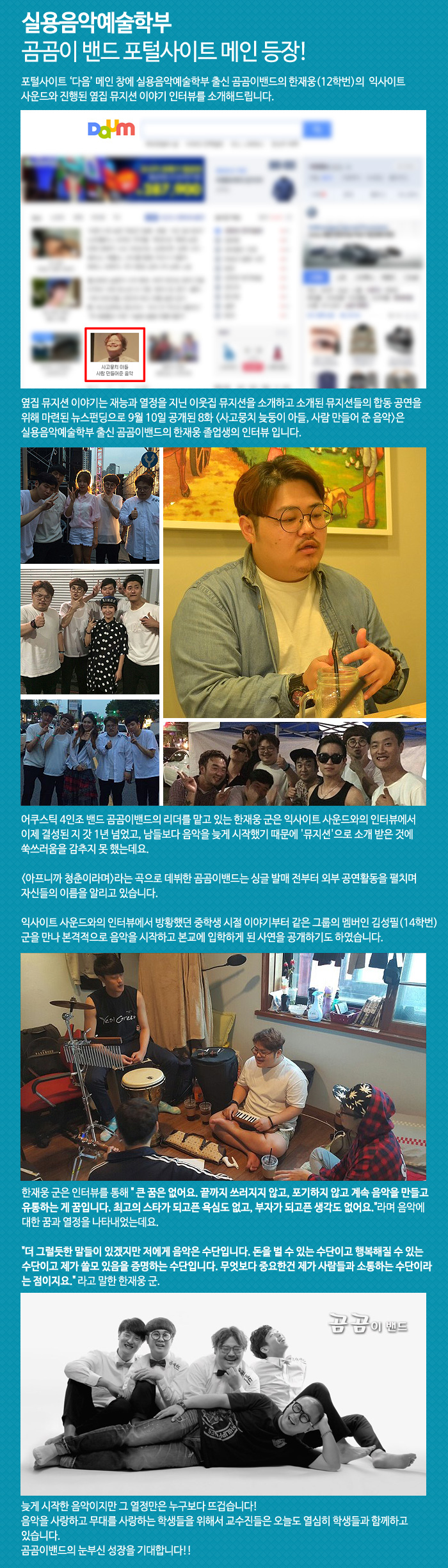포털사이트 ‘다음’ 메인 창에 실용음악예술학부 출신 곰곰이밴드의 한재웅(12학번)의 익사이트사운드와 진행된 옆집 뮤지션 이야기 인터뷰를 소개해드립니다.