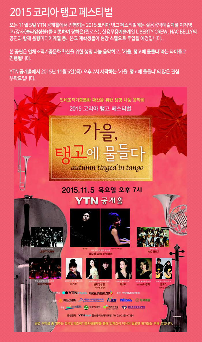 오는 11월 5일 YTN 공개홀에서 진행되는 2015 코리아 탱고 페스티벌에는 실용음악예술학부 이지영 교/강사(솔라앙상블)를 비롯하여 장하은(필로스), 실용무용예술학부 LIBERTY CREW, HAC BELLY의 공연과 함께 음향미디어학부 등.. 본교 재학생들이 현장 스탭으로 투입될 예정입니다.