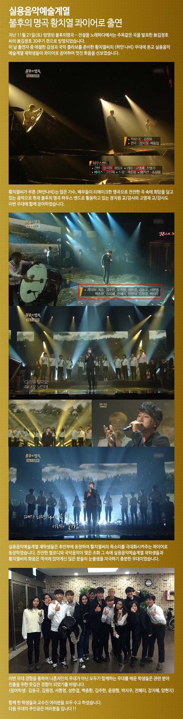 이 날 출연자 중 애절한 감성과 국악 콜라보를 준비한 황치열씨의 <하얀 나비> 무대에 본교 실용음악예술계열 재학생들이 콰이어로 참여하여 멋진 화음을 선보였습니다.