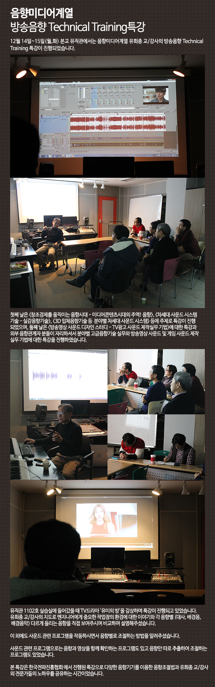 12월 14일~15일(월,화) 본교 뮤직관에서는 음향미디어계열 유회종 교/강사의 방송음향 Technical Training 특강이 진행되었습니다.
