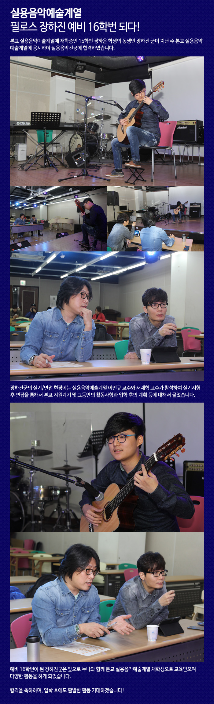 본교 실용음악예술계열 재학중인 15학번 장하은 학생의 동생인 장하진 군이 지난 주 본교 실용음악예술계열에 응시하여 실용음악전공에 합격하였습니다.
