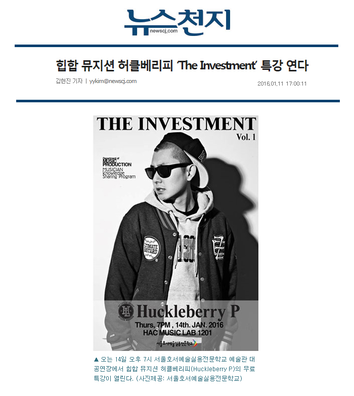 [뉴스천치]힙합 뮤지션 허클베리피 ‘The Investment’ 특강 연다