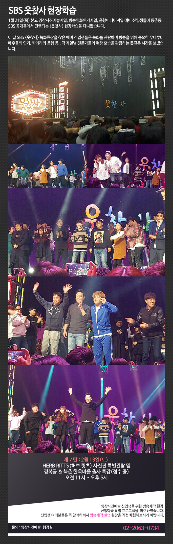 1월 21일(목) 본교 영상사진예술계열, 방송영화연기계열, 음향미디어계열 예비 신입생들이 등촌동 SBS 공개홀에서 진행되는 <웃찾사> 현장학습을 다녀왔습니다.