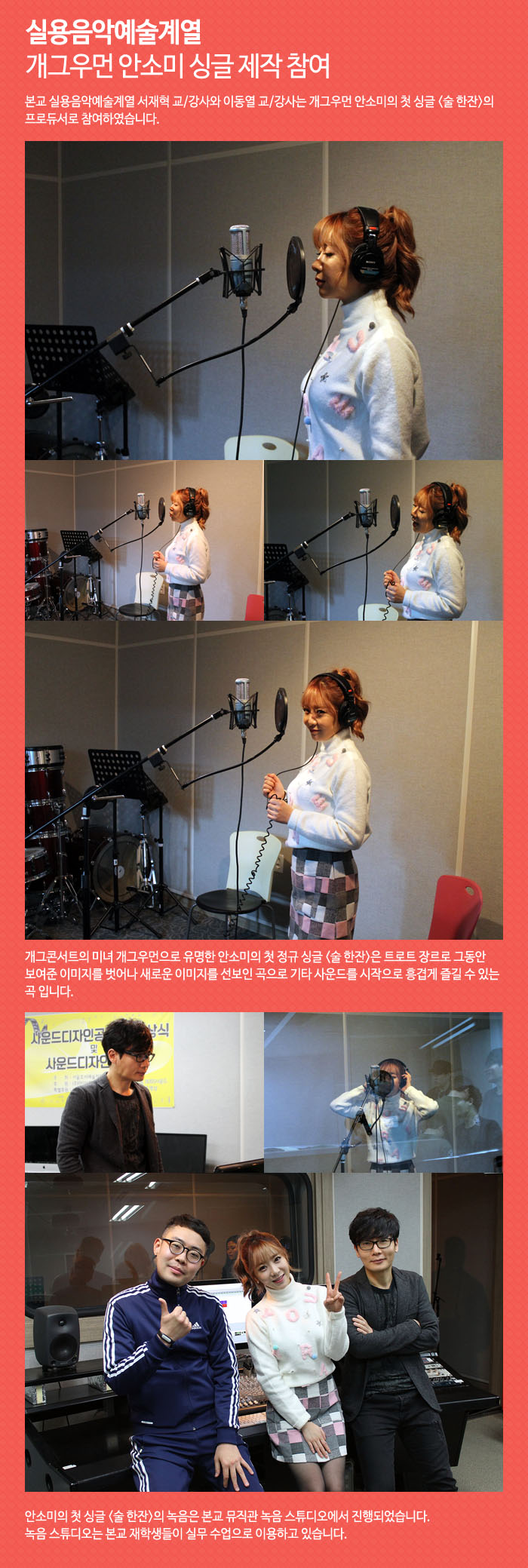 본교 실용음악예술계열 서재혁 교/강사와 이동열 교/강사는 개그우먼 안소미의 첫 싱글 <술 한잔>의 프로듀서로 참여하였습니다.