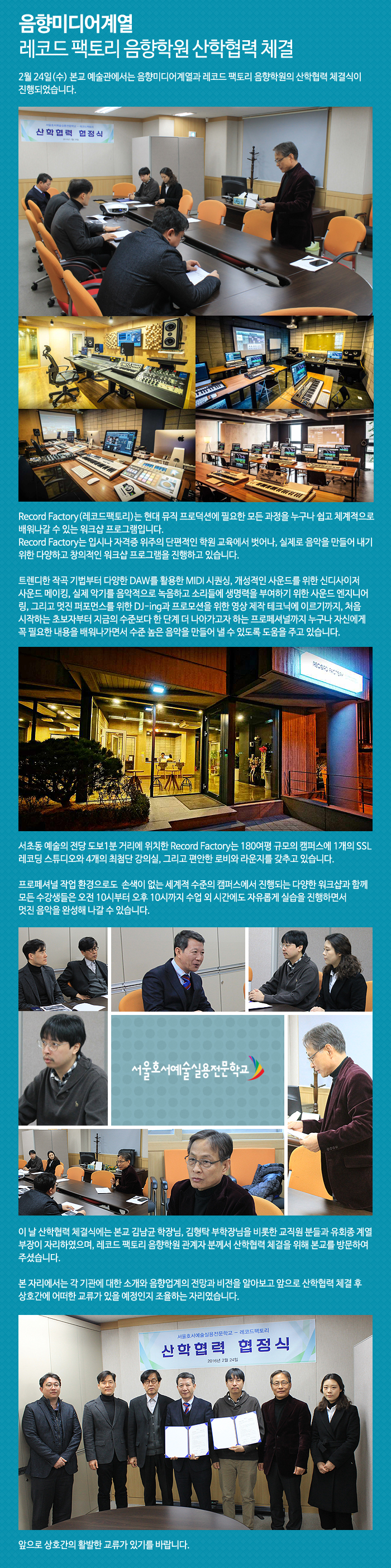 2월 24일(수) 본교 예술관에서는 음향미디어계열과 레코드 팩토리 음향학원의 산학협력 체결식이 진행되었습니다.
