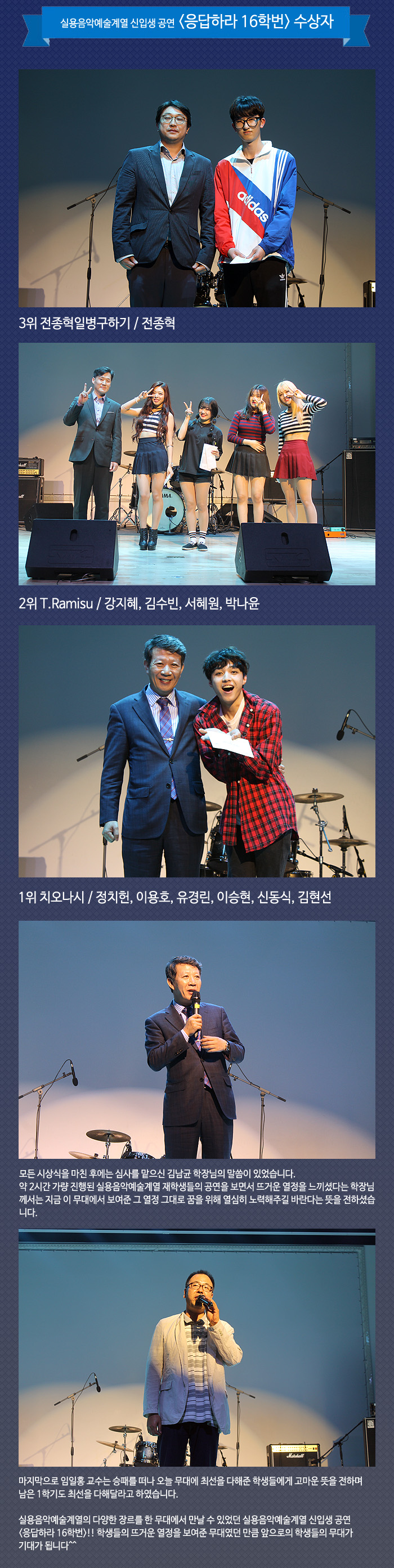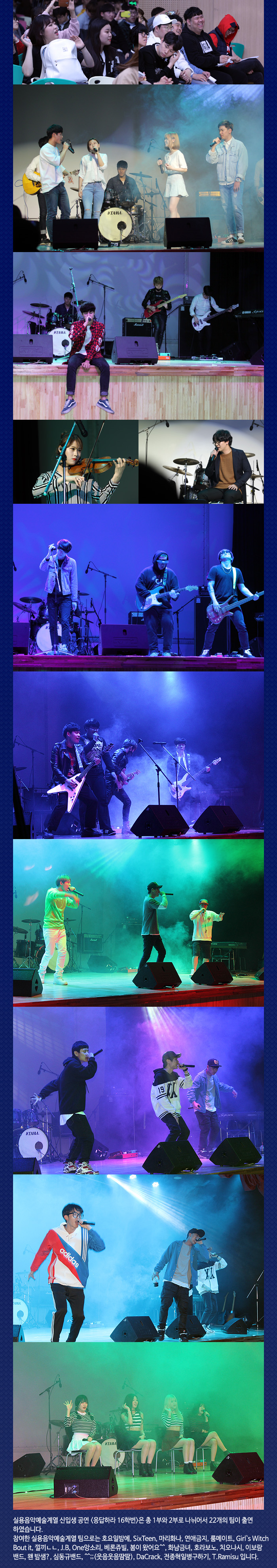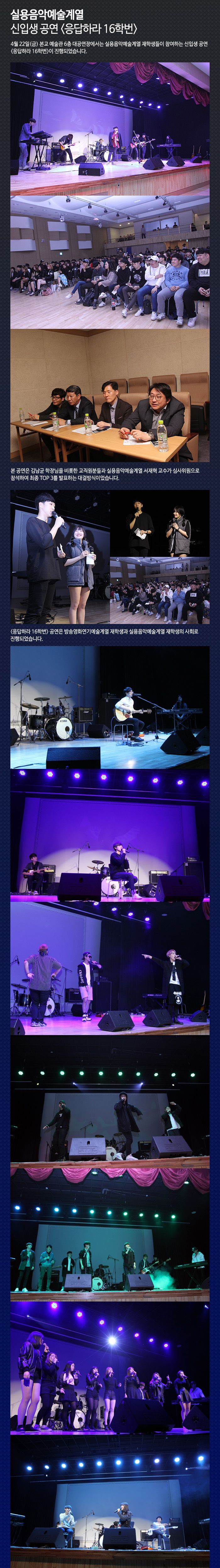 4월 22일(금) 본교 예술관 6층 대공연장에서는 실용음악예술계열 재학생들이 참여하는 신입생 공연 응답하라 16학번이 진행되었습니다.