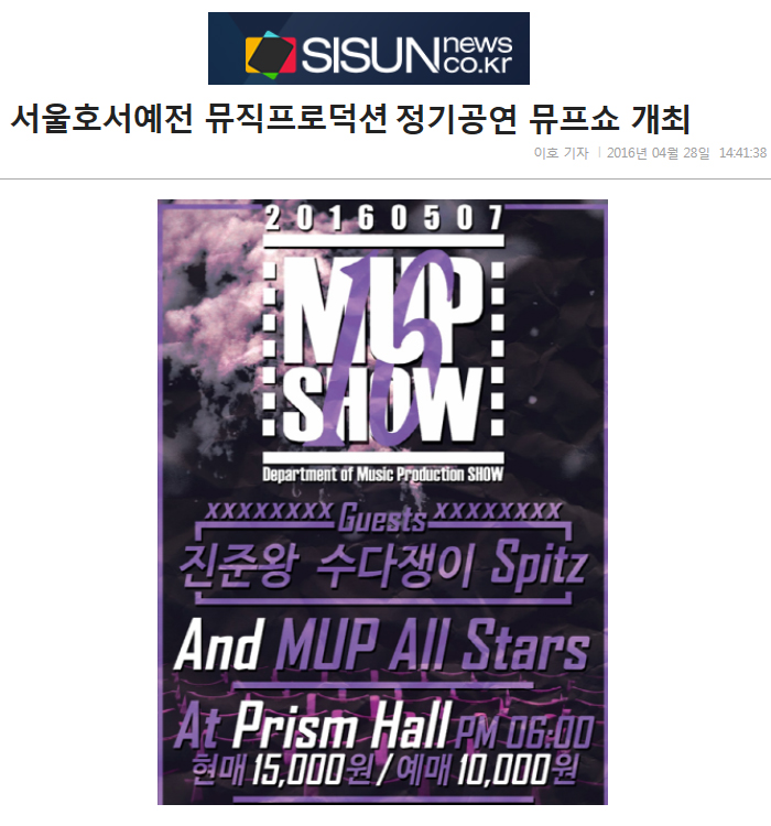 [시선뉴스] 서울호서예술실용전문학교(이하 서울호서예전)에 속한 국내 최대, 최고의 랩·힙합 전문 교육기관인 ‘뮤직프로덕션’ 정기공연 'MUP Show(뮤프쇼)'가 16번째 공연을 개최한다.