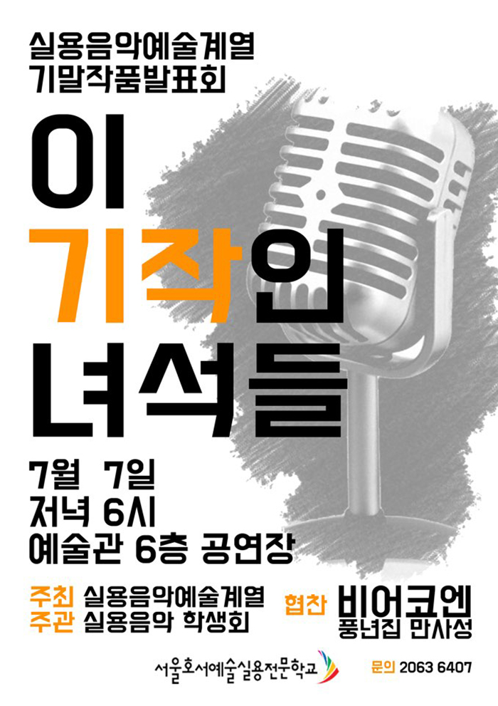 실용음악예술계열 <이기작인녀석들> 기말작품발표회가 7월 7일(목) 오후 6시에 예술관 6층 대강당에서 진행됩니다.