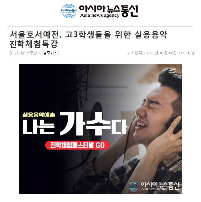 고3수험생들을 위한 실용음악 진학체험특강이 2016년 7월 23일(토)오전10시 강서구 가양동에 위치한 서울호서예술실용전문학교(이사 서울호서예전)에서 진행된다.