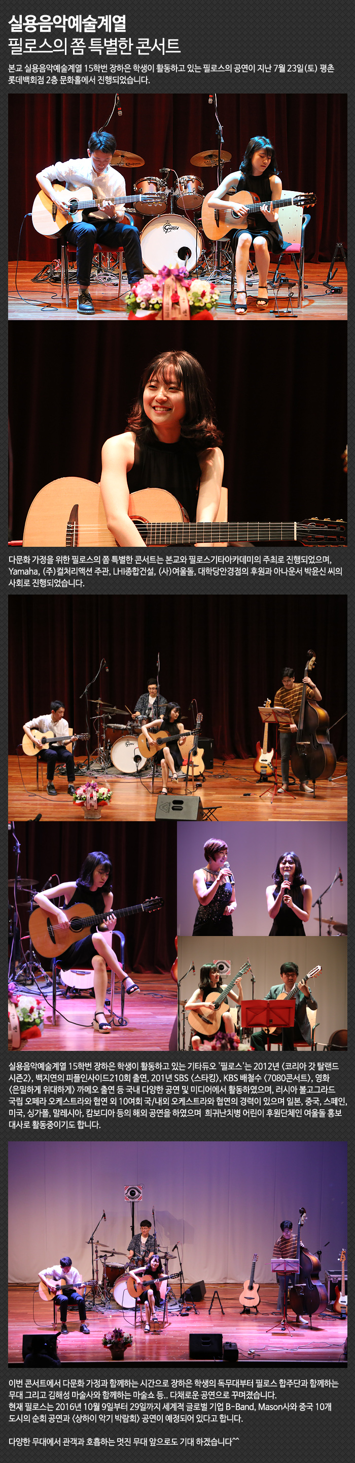 본교 실용음악예술계열 15학번 장하은 학생이 활동하고 있는 필로스의 공연이 지난 7월 23일(토) 평촌롯데백회점 2층 문화홀에서 진행되었습니다.