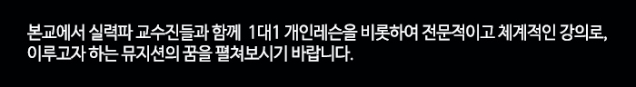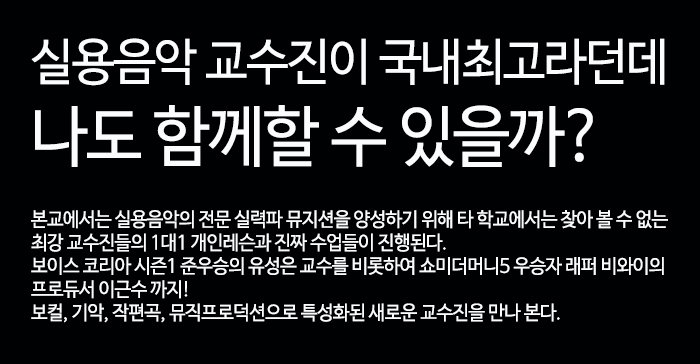 본교에서는 실용음악의 전문 실력파 뮤지션을 양성하기 위해 타 학교에서는 찾아 볼 수 없는 최강 교수진들의 1대1 개인레슨과 진짜 수업들이 진행됩니다.