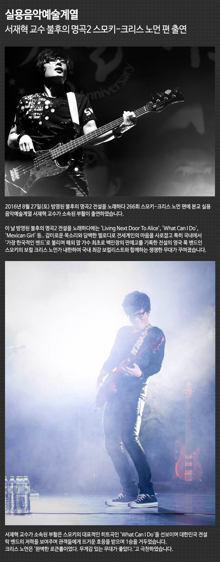 2016년 8월 27일(토) 방영된 불후의 명곡2 전설을 노래하다 266회 스모키-크리스 노먼 편에 본교 실용음악예술계열 서재혁 교수가 소속된 부활이 출연하였습니다.