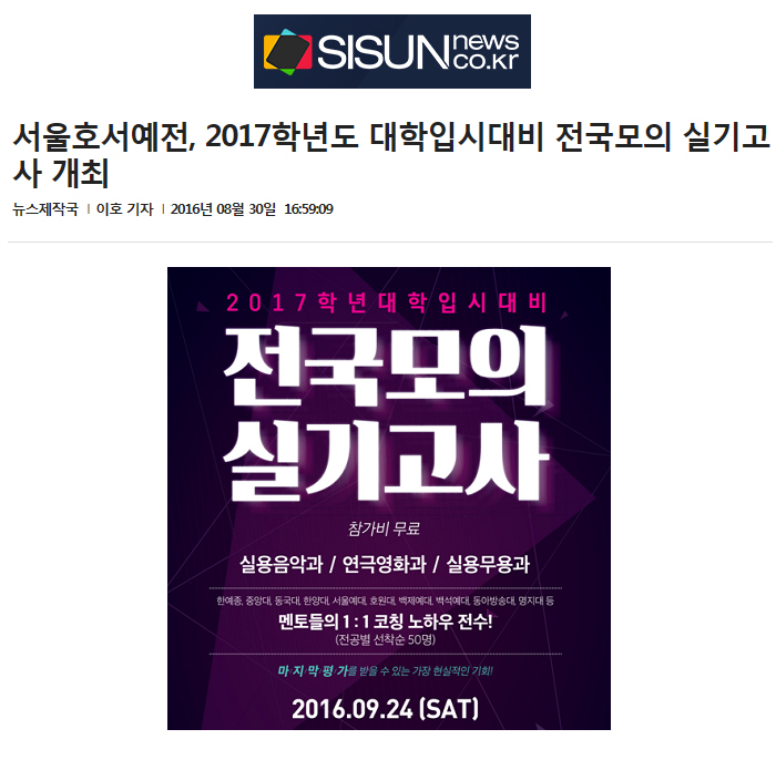 [시선뉴스] 서울호서예술실용전문학교(이하 서울호서예전)가 고3및 2017학년도 입시대상자들을 위한 실용음악과, 연극영화과, 실용무용과 전국모의실기고사가 9월24일 (토) 오전 11시에 교내에서 개최한다고 30일 전했다.
