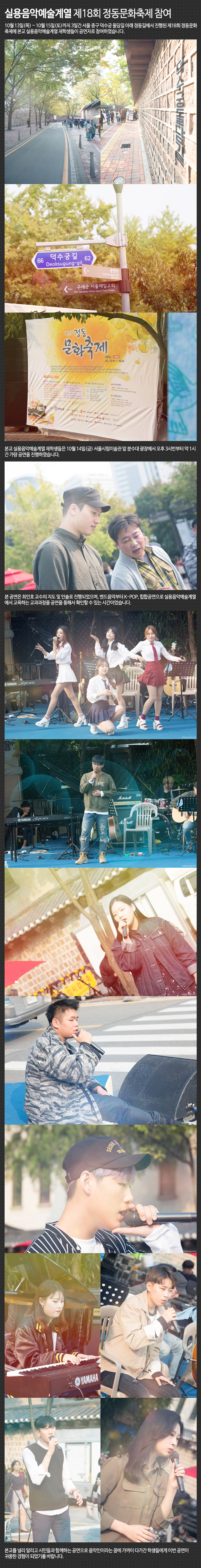 10월 13일(목) ~ 10월 15일(토)까지 3일간 서울 중구 덕수궁 돌담길 아래 정동길에서 진행된 제18회 정동문화축제에 본교 실용음악예술계열 재학생들이 공연자로 참여하였습니다.