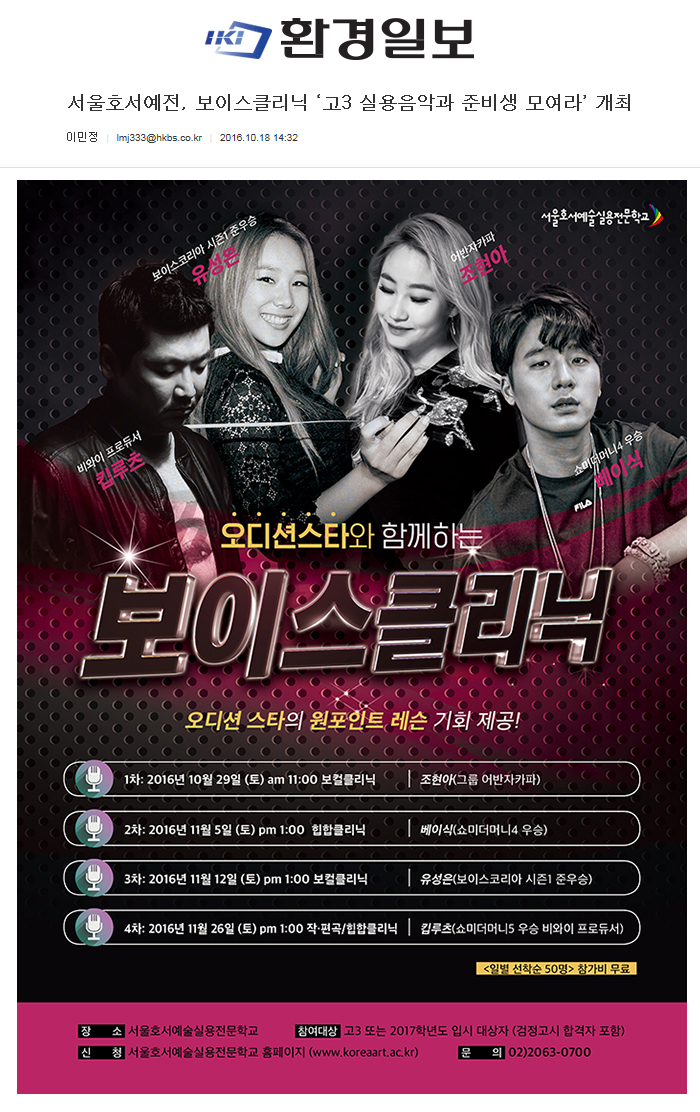 [환경일보] 이민정 기자 = 서울호서예술실용전문학교(이하 호서예전) 실용음악과가 보이스클리닉 ‘고3 실용음악과 준비생 모여라’를 개최한다. 보이스클리닉은 음악 오디션을 뜨겁게 달군 어반자카파 조현아, 쇼미더머니4 우승 베이식, 보이스코리아 준우승 유성은, 쇼미더머니5 우승 비와이의 프로듀서 킵루츠가 함께한다.