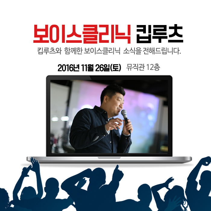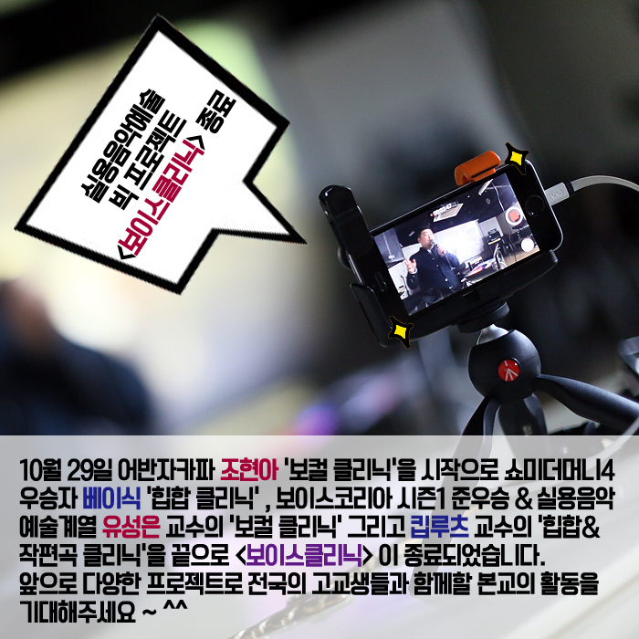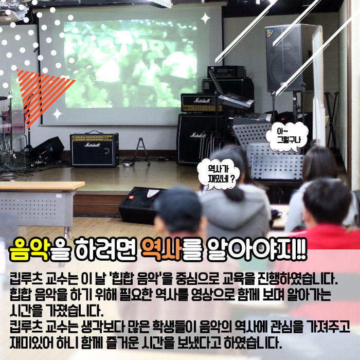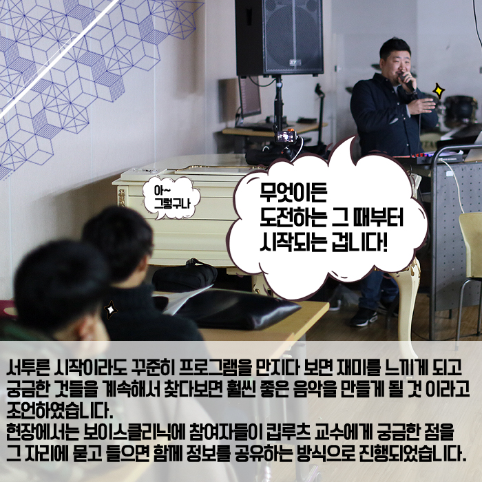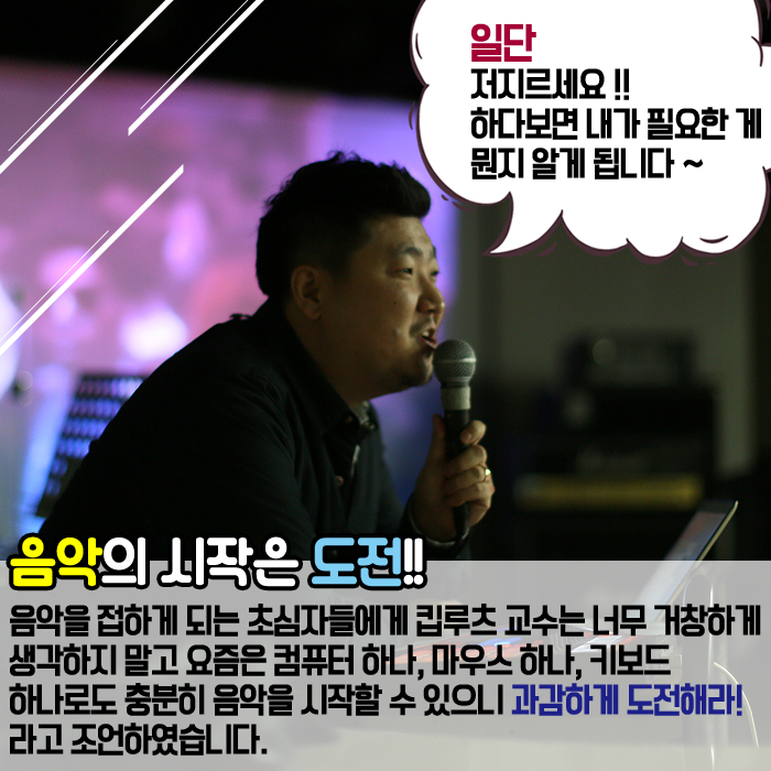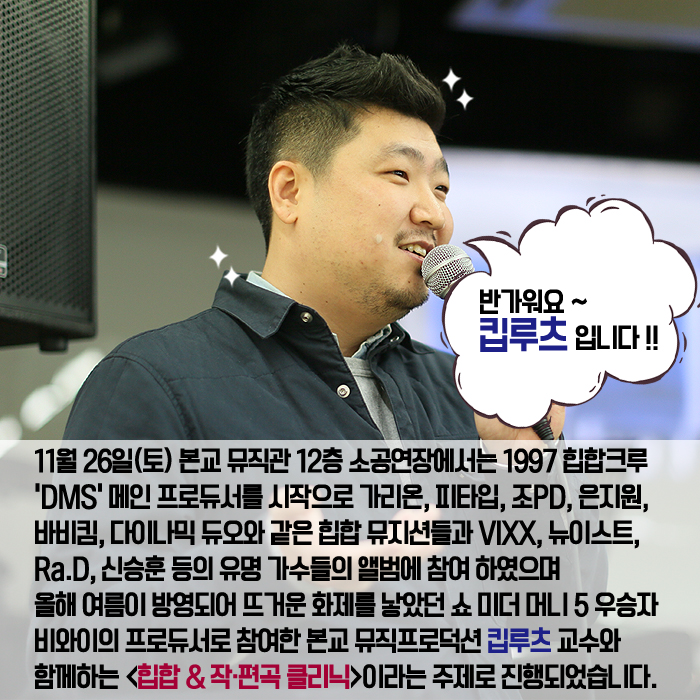 11월 26일(토) 본교 뮤직관 12층 소공연장에서는 1997 힙합크루 'DMS' 메인 프로듀서를 시작으로 가리온, 피타입, 조PD, 은지원, 바비킴, 다이나믹 듀오와 같은 힙합 뮤지션들과 VIXX, 뉴이스트, Ra.D, 신승훈 등의 유명 가수들의 앨범에 참여 하였으며 올해 여름이 방영되어 뜨거운 화제를 낳았던 Show Me The Money5 우승자 비와이의 프로듀서로 참여한 본교 뮤직프로덕션 킵루츠 교수와 함께하는 <힙합 & 작·편곡 클리닉>이라는 주제로 진행되었습니다.