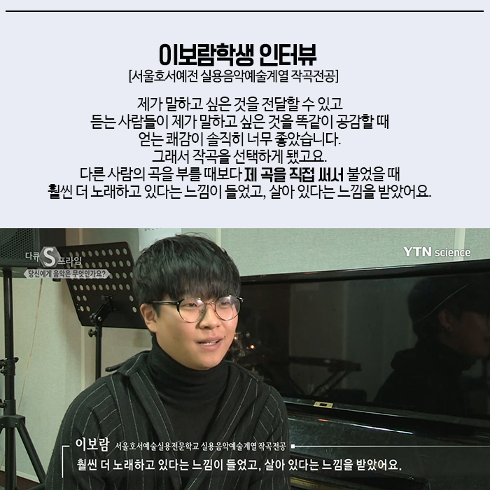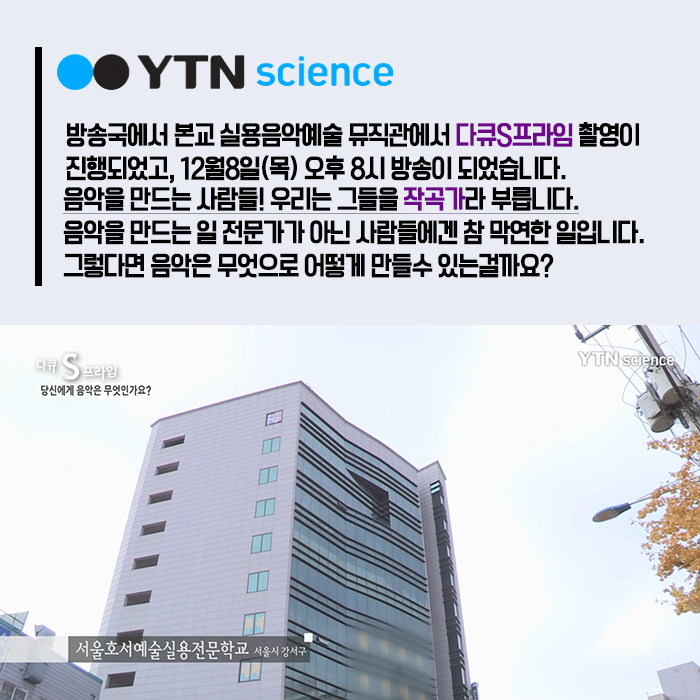 YTN사이언스 다큐S프라임에서는 당신에게 음악은 무엇인가요? 라는 주제로 본교 실용음악예술계열에 촬영을 나왔습니다.