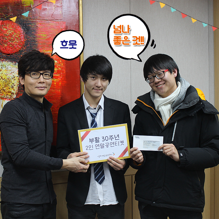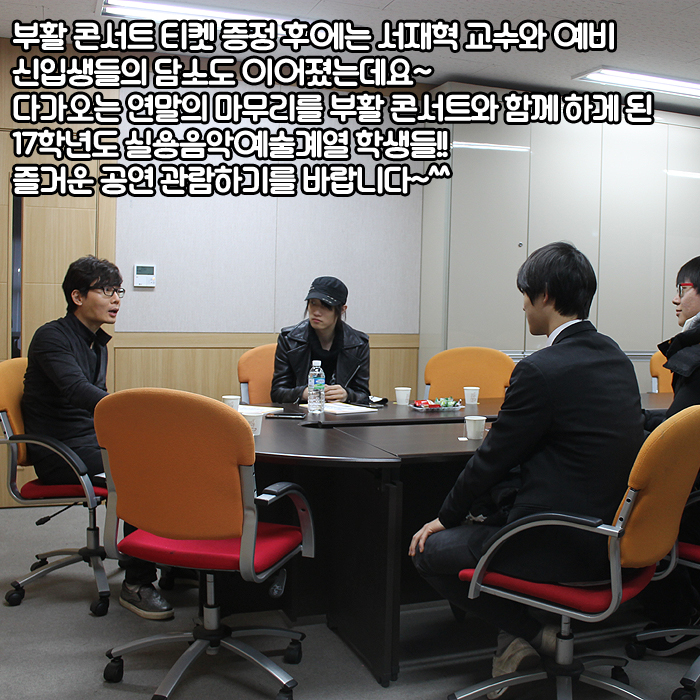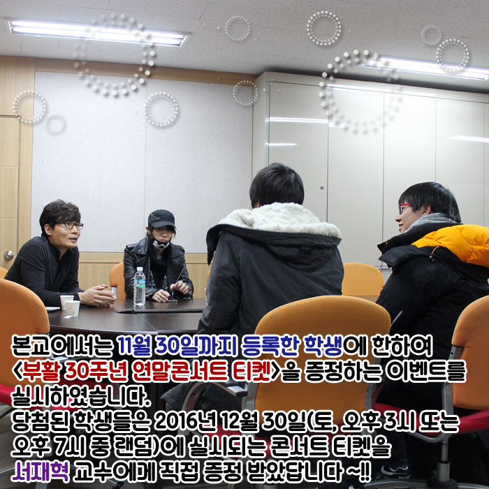 본교에서는 11월 30일까지 등록한 학생에 한하여 '부활 30주년 연말콘서트 티켓'을 증정하는 이벤트를 진행하여 당첨자들과 서재혁 교수과 함께하는 시간을 가졌습니다.