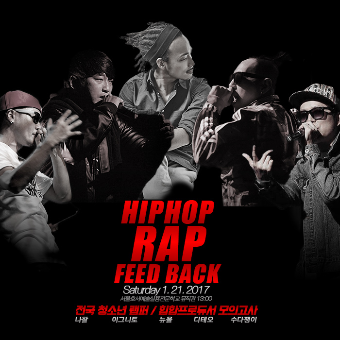 전국 청소년 랩퍼 / 힙합프로듀서 모의고사를 2017년 1월 21일(토) 오후1시 본교에서 진행이 됩니다. 이번 모의고사 랩 피드백에는 나찰, 이그니토, 뉴올, 디테오, 수다쟁이가 함께 합니다.