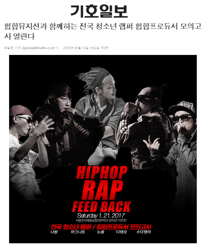 [기호일보]힙합뮤지션과 함께하는 전국 청소년 랩퍼 힙합프로듀서 모의고사 열린다