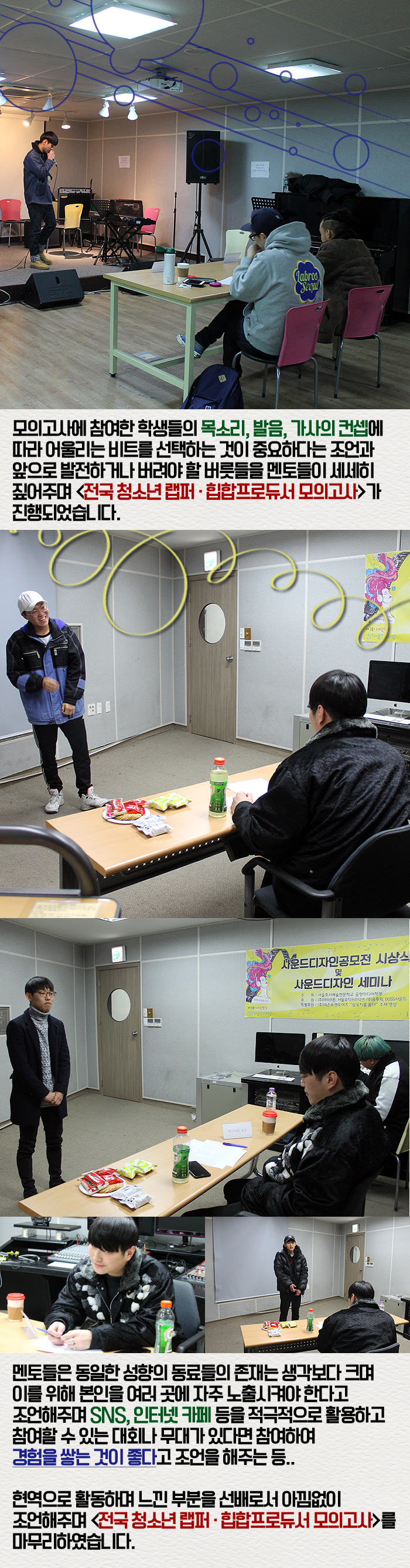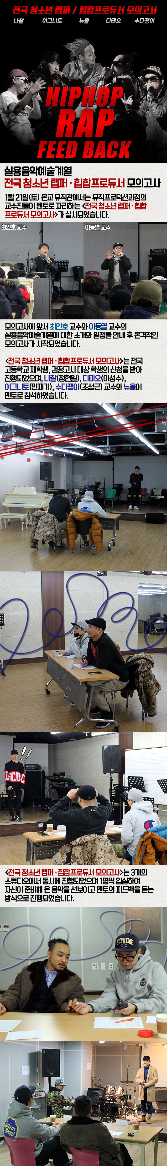 1월 21일(토) 본교 뮤직관에서는 뮤직프로덕션과정의 교수진들이 멘토로 자리하는 <전국 청소년 랩퍼 · 힙합프로듀서 모의고사>가 실시되었습니다.